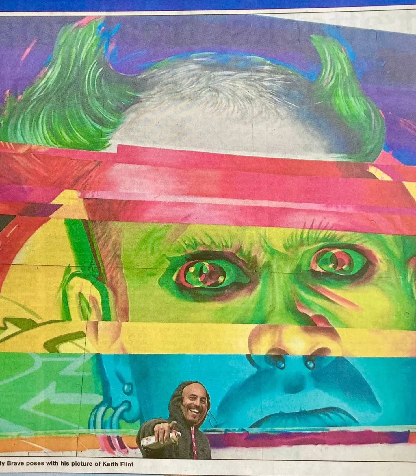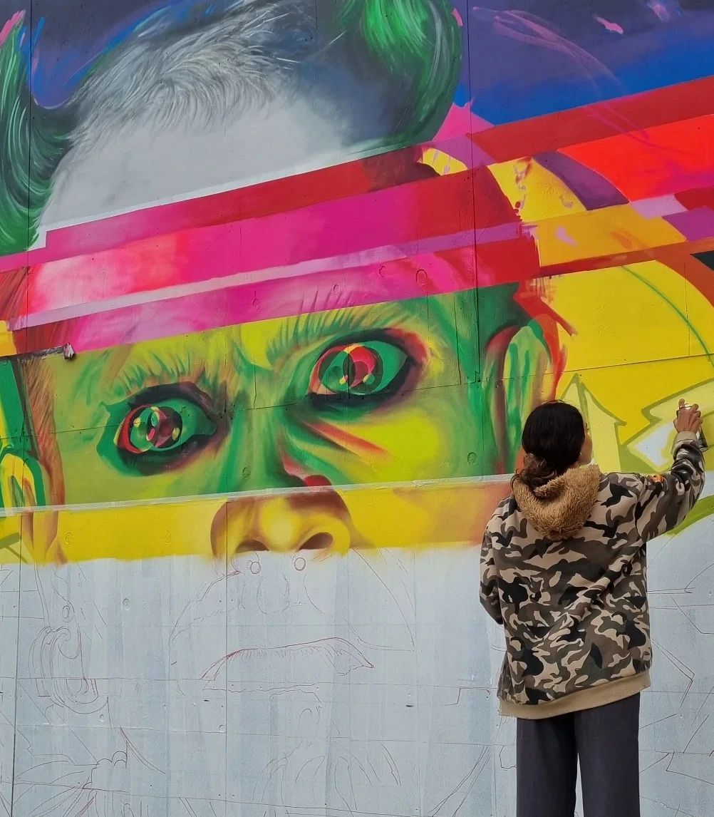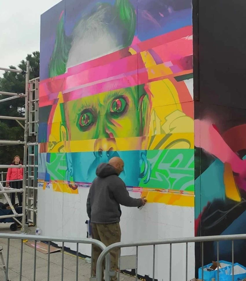 shouts to the crew for making it happen again, the standard of work this year was amazing and the vibes were great.So many people I know, love and admire all coming to the city where I live was amazing.Thanks for brightening up Southend yous lot.Portrait is of course our man Keef Flint, or as many people called him "the fire starter' from the band @theprodigyofficialPretty emotional painting someone who had given us all such a great time but is sadly no longer with us. During the 3 day painting process A lot of prodigy fans came and told me stories of Raveing, showing me their prodigy tattoos and exchanging memories of seeing them live at various events. The music continues and like I've said before , legends never die.None of us are alone, there is always someone who will listen, so don't bottle it up guys, talk. Get support from people who know how you're feeling, they are out there & it will help.Peace.#Spraycanart #bravearts #glitchgraffiti #graffitifuturism #contemporaryart #spraypainting #spraycanart #graffiti #southendcityjam#mentalhealth #suicideprevention #samaritans#contemporaryspraycanart #modernartist #modernart #newart #graffitiart #artforsale #artexhibition #newart #essex #prodigy #glitchart #glitchaesthetic #theprodigy #glitch #Urbancontemporaryart #grafuturism